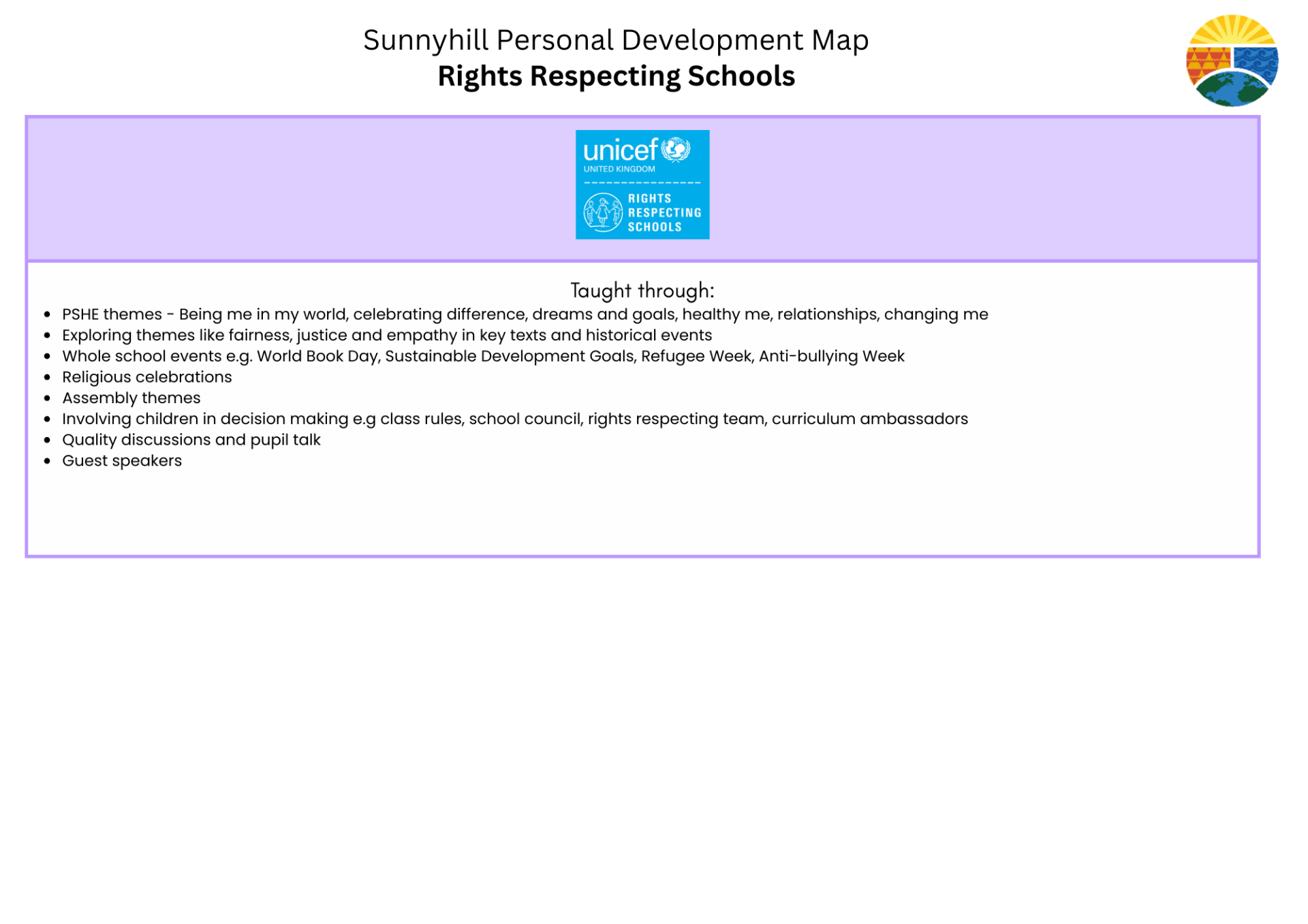 At Sunnyhill, our personal development curriculum has, at its foundation, a structured programme of PSHE and RE lessons timetabled weekly from Reception to Year 6.